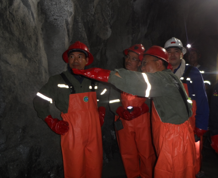 公司副總裁、中色非礦總經(jīng)理王春來、中色非礦常務(wù)副總張晉軍等經(jīng)理層與施工方一道在井下查看工程進(jìn)度