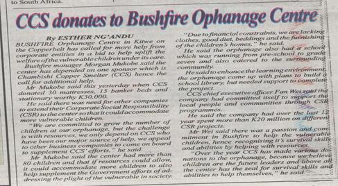 在捐贈儀式上,孤兒院負(fù)責(zé)人Morgan Mukobe表示,得益于CCS的愛心捐助,孤兒院可以給孩子們提供更好的保障,可以容納救助更多的孩子,造福了孤兒這一社會弱勢群體,對CCS一直以來對孤兒院的援助表示感謝。CCS總經(jīng)理范巍在發(fā)言中表示,公司成立以來,在社會責(zé)任項目上花費了超過2千萬克瓦查,公司一直將造福當(dāng)?shù)厝嗣?、參加?dāng)?shù)匦^(qū)建設(shè)作為公司義不容辭的責(zé)任。兒童是未來的領(lǐng)導(dǎo)者和國家的希望,CCS能夠為Bushfire的發(fā)展、為孩子們提供力所能及的支持和幫助感到欣慰。