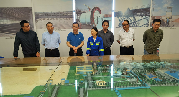 張晉軍(左三)在穆利亞希濕法冶煉廠生產(chǎn)工藝流程模型面前聽取情況介紹