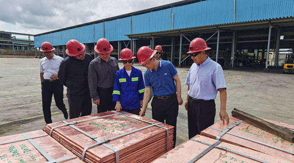 張晉軍(右二)在穆利亞希萃取電積車間堆放的陰極銅前詢問有關(guān)情況