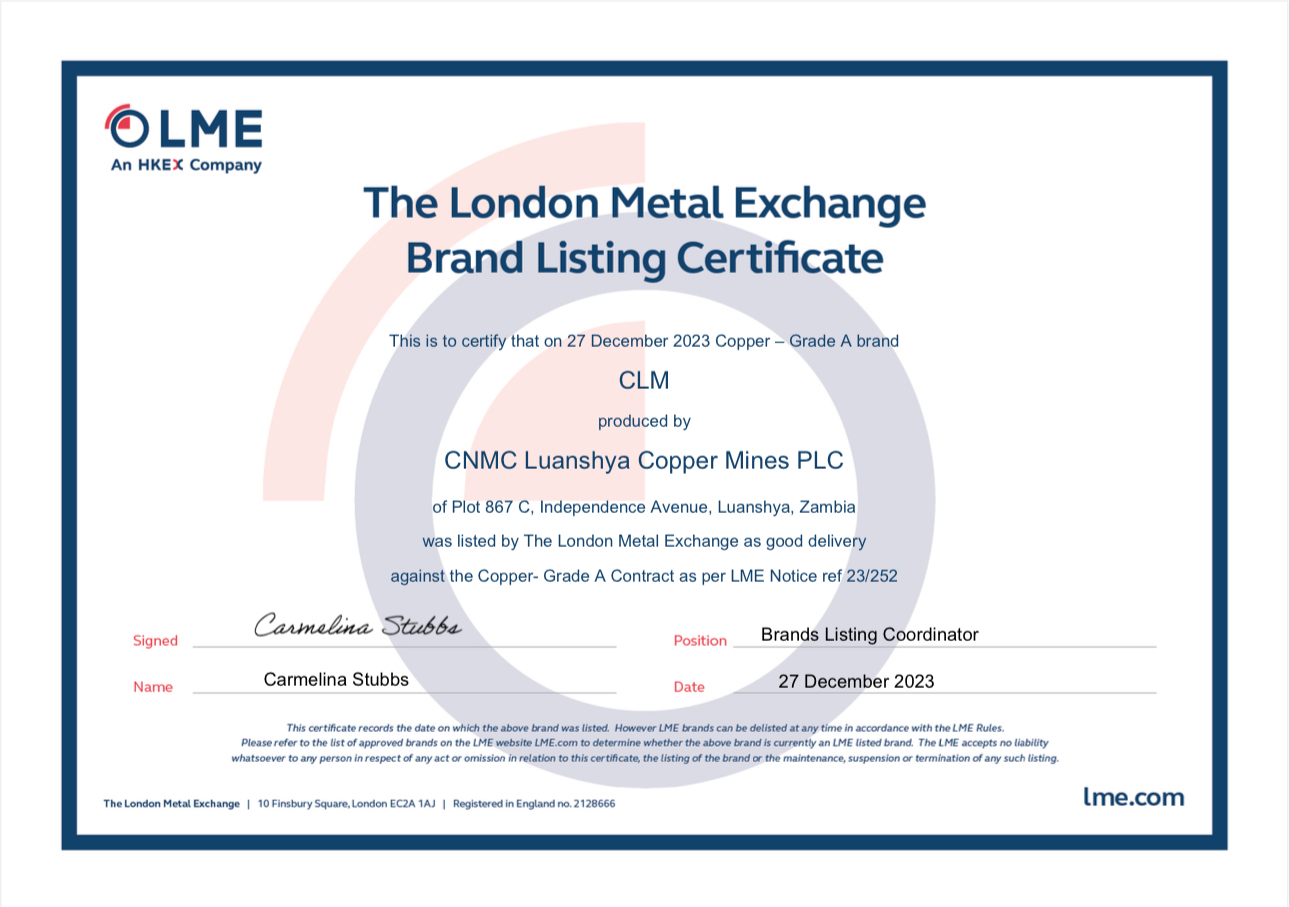 2023年12月27日,倫敦金屬交易所(LME)發(fā)布通告,中色盧安夏銅業(yè)有限公司(簡稱:中色盧安夏)生產(chǎn)的“CLM”牌A級陰極銅正式進(jìn)入LME注冊牌號清單之列。