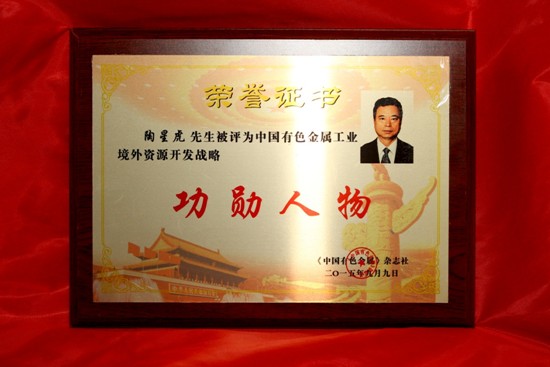 2015年9月9日,由中國(guó)有色金屬工業(yè)協(xié)會(huì)支持、《中國(guó)有色金屬》雜誌社主辦的“中國(guó)有色金屬工業(yè)境外資源開發(fā)戰(zhàn)略功勛企業(yè)和人物頒獎(jiǎng)典禮暨中國(guó)有色金屬工業(yè)境外資源開發(fā)風(fēng)險(xiǎn)防範(fàn)與控制高峰論壇”在北京舉行。中國(guó)有色集團(tuán)、公司董事會(huì)主席、總裁陶星虎分別榮獲功勛企業(yè)和功勛人物稱號(hào),彰顯了業(yè)界對(duì)中國(guó)有色集團(tuán)及中國(guó)有色礦業(yè)“走出去”的認(rèn)可。