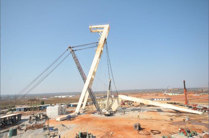 東南礦體主井井架總高度為59米,井架總重量608噸,是一項技術(shù)難度和安全風險級別特高的重量級任務(wù)。中色非礦克服重重困難、在非洲缺乏關(guān)鍵施工設(shè)備的情況下,與承建單位、設(shè)計單位、監(jiān)理單位等多方歷經(jīng)數(shù)次專題會議,進行反復(fù)設(shè)計論證,誕生了雙桅桿起吊井架安裝方案,創(chuàng)造了非洲礦建新的歷史。