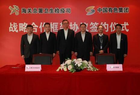 海關(guān)總署衛(wèi)生檢疫司林偉司長(zhǎng)與中國(guó)有色集團(tuán)副總經(jīng)理張晉軍代表雙方在戰(zhàn)略合作框架協(xié)議上簽字。簽約儀式前,王彤宙主席陪同張際文副署長(zhǎng)一行參觀了中國(guó)有色集團(tuán)展廳。